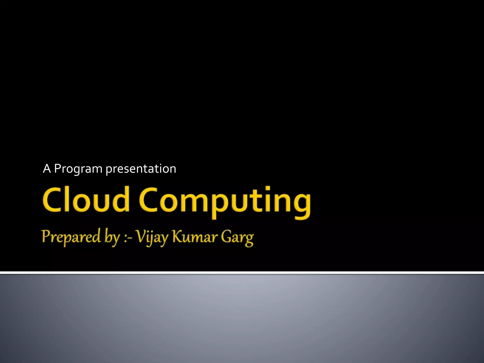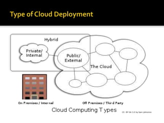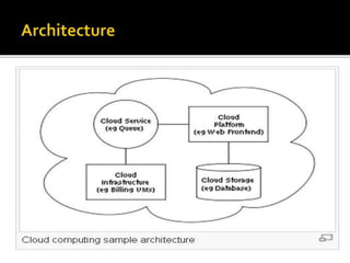 This document provides an overview of cloud computing, including definitions of cloud computing, its history and characteristics. It discusses the types of cloud deployment models (public, private, hybrid etc.), types of cloud services (IaaS, PaaS, SaaS), common cloud applications, advantages and disadvantages. The document aims to explain what cloud computing is, how it works, why it is useful and some considerations around using cloud services.