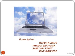 The document discusses cloud computing, providing an overview of what it is, its history and evolution, characteristics, components, infrastructure models, commercial offerings, advantages, and disadvantages. Specifically, cloud computing is defined as a new class of network-based computing that takes place over the Internet, allowing users to access hardware and software services remotely via the web. The cloud's flexibility, scalability, and cost benefits are highlighted, though concerns around internet dependency, limited features, and data security are also summarized.
