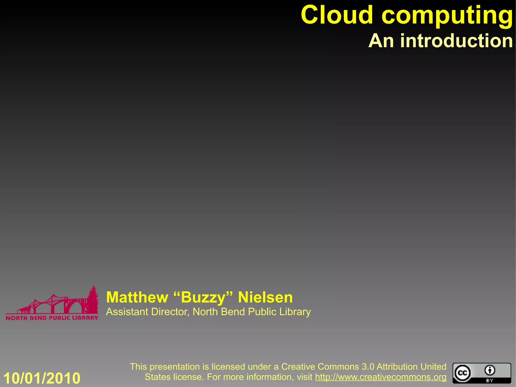This document serves as an introductory presentation on cloud computing, explaining its definition as accessing services and information over the internet instead of relying solely on local devices. It outlines various examples, advantages, and disadvantages of cloud computing, such as accessibility and backup capabilities, while also noting concerns about internet dependency and privacy. The presentation encourages exploring tools and services related to cloud computing for enhanced data management and collaboration.