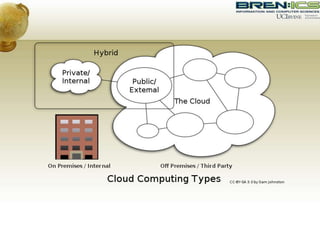 Cloud computing is a model that offers on-demand access to a shared pool of configurable computing resources, characterized by self-service, resource pooling, and measured services. It includes three service models: Software as a Service (SaaS), Platform as a Service (PaaS), and Infrastructure as a Service (IaaS), each catering to different consumer needs and control over applications. The document further discusses deployment models, advantages, and highlights specific platforms such as Amazon EC2 and Hadoop for big data processing.