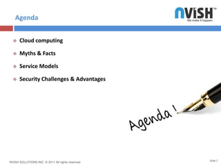 This document provides an overview of cloud computing including definitions, characteristics, service models, deployment models, and security considerations. Cloud computing is defined as on-demand access to configurable computing resources that can be provisioned with minimal effort. Key characteristics include scalability, pay-per-use model, and enabling mobile applications. The three service models are Software as a Service (SaaS), Platform as a Service (PaaS), and Infrastructure as a Service (IaaS). The four deployment models are private, community, public, and hybrid clouds. General security challenges include trusting vendors and loss of physical control, while advantages were not outlined.