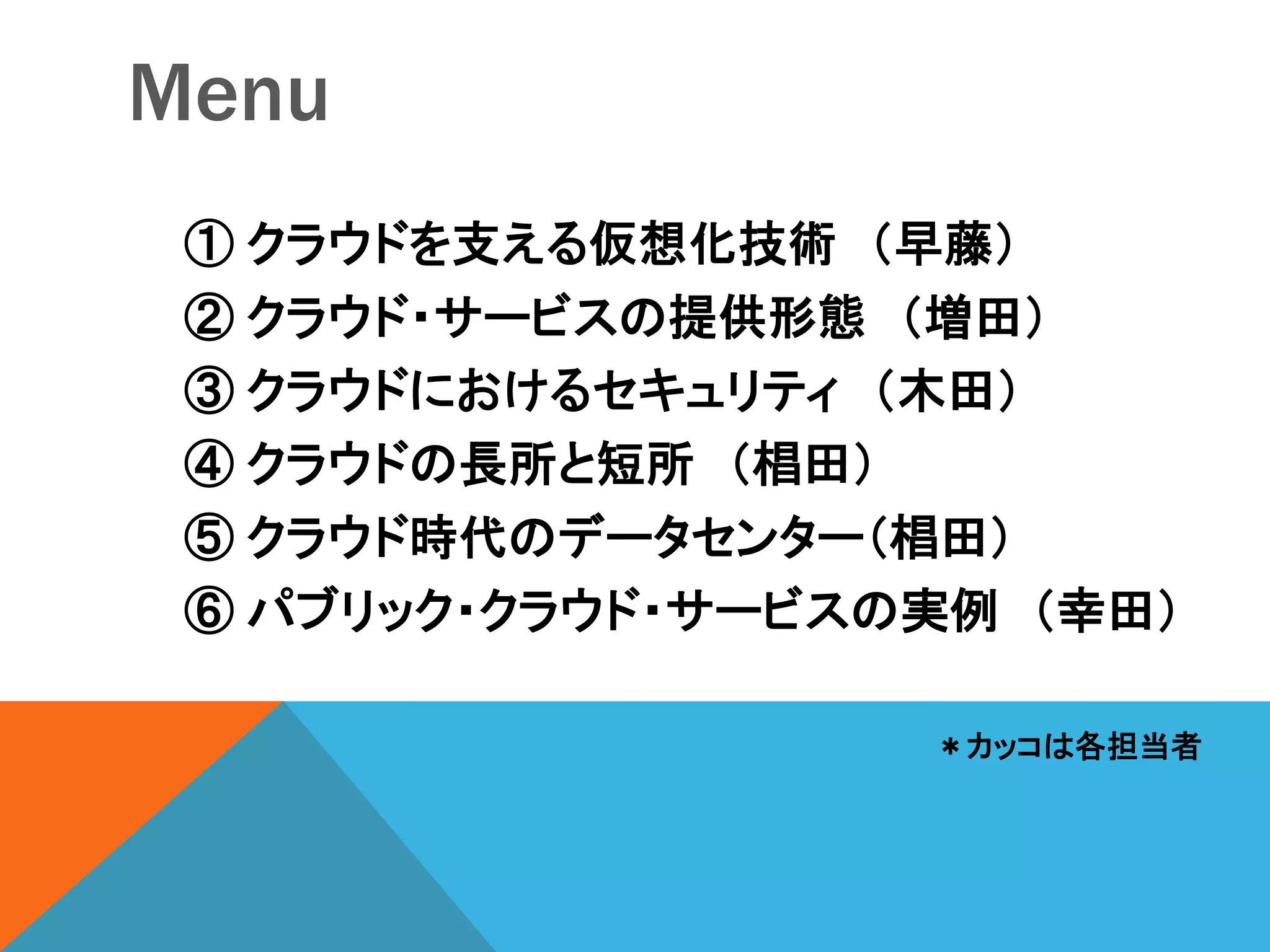 (早藤) ② クラウド・サービスの提供形態 (増田) ③ クラウドにおけるセキュリティ (木田) ④ クラウドの長所と短所 (椙田) ⑤ クラウド時代のデータセンター(椙田) ⑥ パブリック・クラウド・サービスの実例 (幸田) *カッコは各担当者