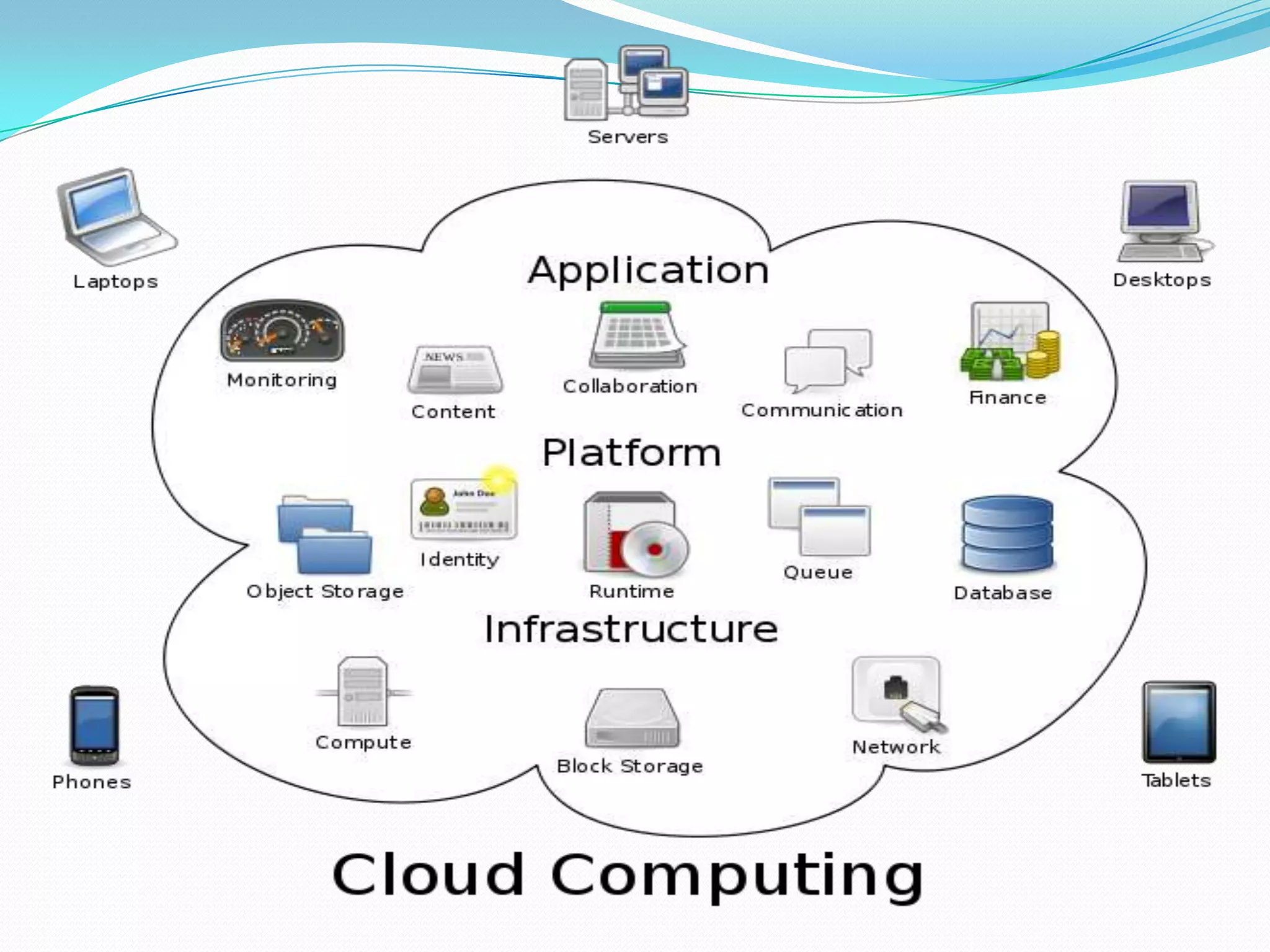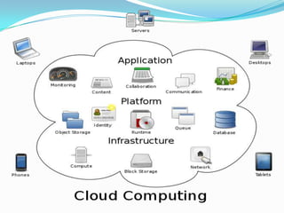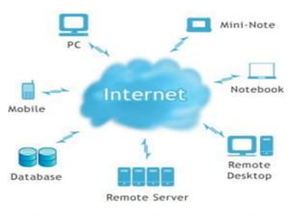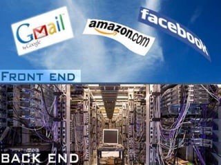 Cloud computing provides on-demand access to shared computing resources and infrastructure over the Internet. It is divided into front-end and back-end components that connect through a network. The front-end includes client interfaces, while the back-end comprises servers, storage, and other resources that create the "cloud". Cloud services are delivered dynamically and billed based on usage. Resources are shared in a multi-tenant model accessible from any device.