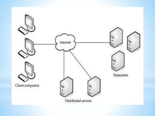 Cloud computing involves delivering computing services over the internet. It has three main components: client computers, distributed servers located in different geographic locations, and data centers housing servers and applications. There are three main service models: Software as a Service (SaaS) which provides required software; Platform as a Service (PaaS) which provides operating systems and networks; and Infrastructure as a Service (IaaS) which provides basic network access. Deployment models include public, private, hybrid, and community clouds based on access restrictions. Big data refers to very large amounts of digital data that cannot be analyzed with traditional techniques, and requires distributed processing across cloud infrastructure to gain insights.