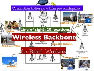 The document discusses relief efforts in Haiti following the 2010 earthquake that utilized a triad approach of wireless networks, social media, and cloud computing. It describes how a WiFi network was set up within a week to provide internet access to relief workers, how SMS texts were used to report emergencies and coordinate aid, and how cloud computing resources supported applications to help reunite families and map needs. The triad approach helped increase communication and coordination among relief groups working in the crisis response.