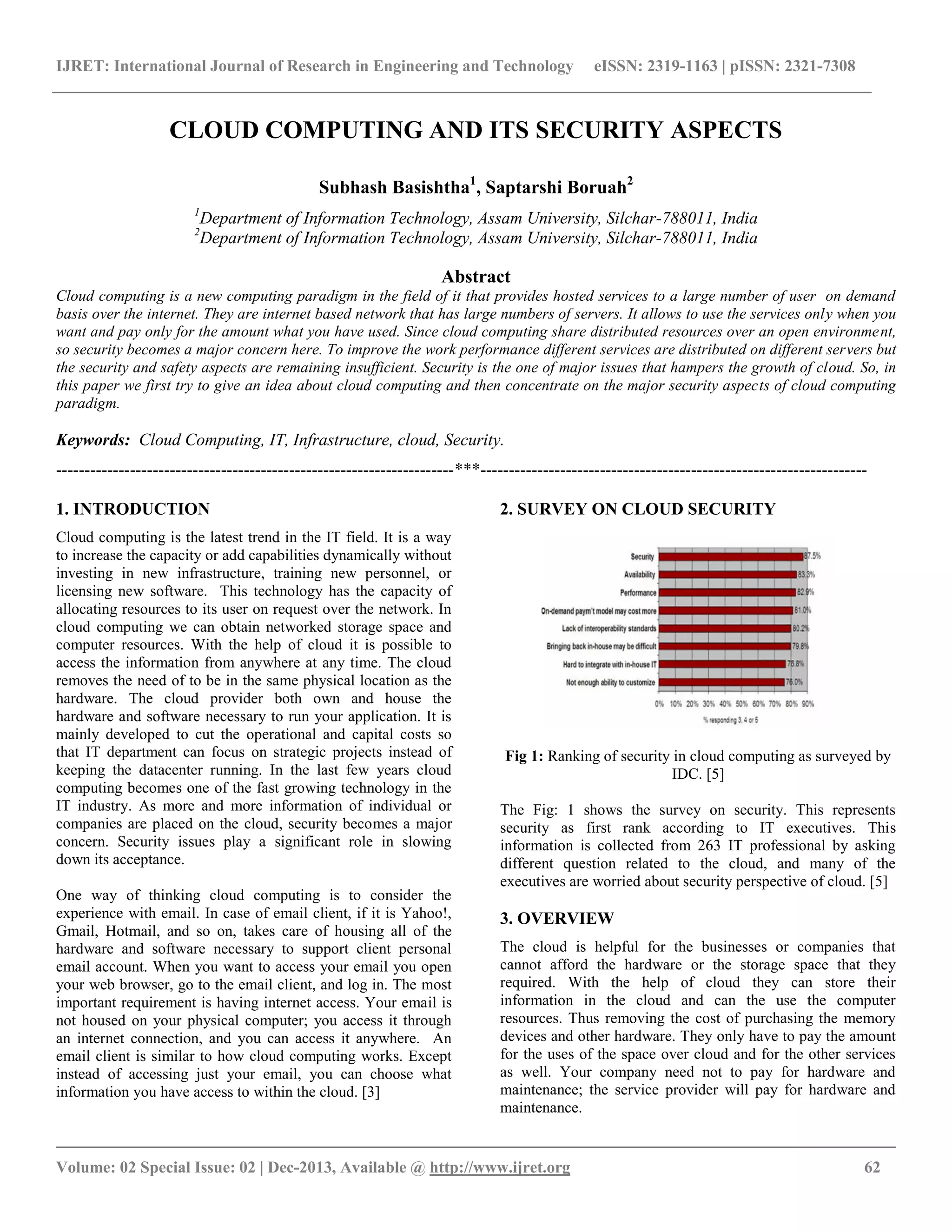 This document discusses cloud computing and its security aspects. It begins by defining cloud computing as a new computing paradigm that provides hosted services over the internet on demand. Security is identified as a major concern for cloud computing since data and services are distributed over an open environment. The document then examines different types of clouds and cloud providers, and explores some common security issues in cloud computing including confidentiality, integrity, availability, and privacy. It emphasizes that security needs to be carefully considered for cloud computing to gain wider acceptance.