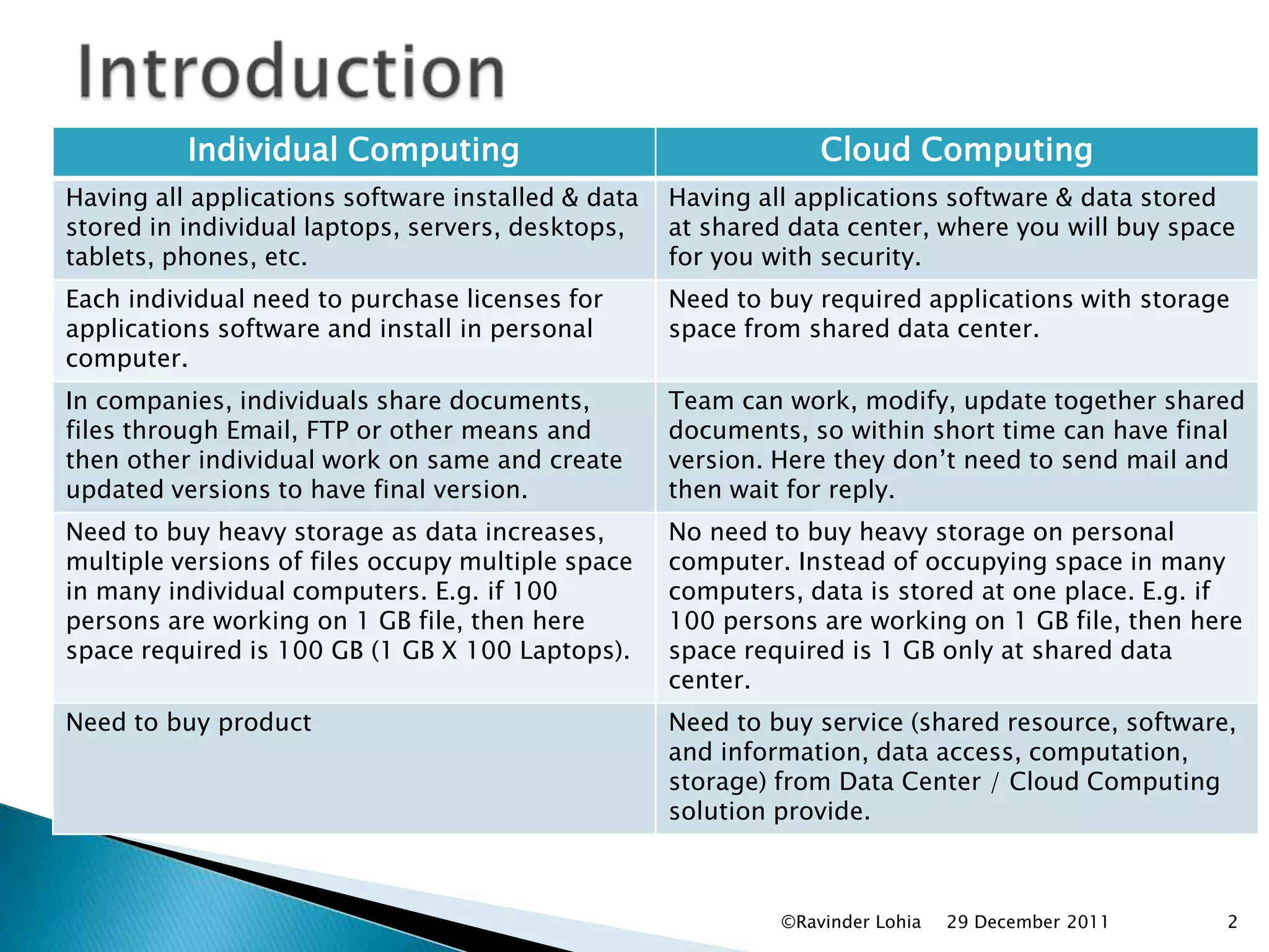 - Cloud computing involves storing applications and data on shared servers rather than individual devices. This allows for collaboration and access from anywhere with an internet connection. Some key benefits include reduced upfront costs, easy sharing of files and real-time collaboration, automatic software updates, and scalable storage as needs increase or decrease. Examples include using web-based email rather than local email software or accessing bank applications via a web browser from any location.