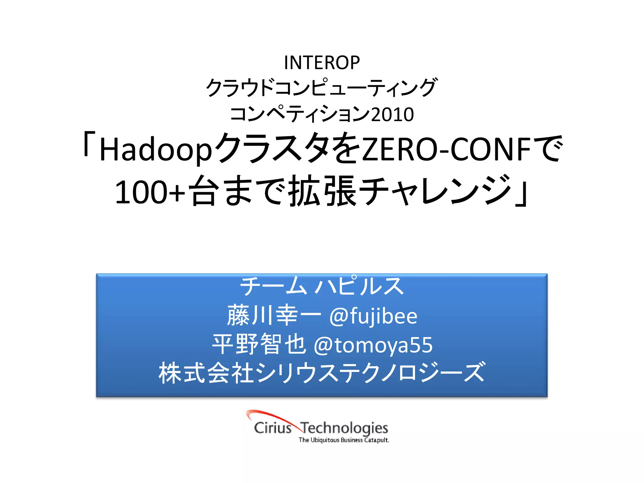 クラウドコンピューティング コンペティション2010 「HadoopクラスタをZERO-CONFで 100+台まで拡張チャレンジ」 チーム ハピルス 藤川幸一 @fujibee 平野智也 @tomoya55 株式会社シリウステクノロジーズ
