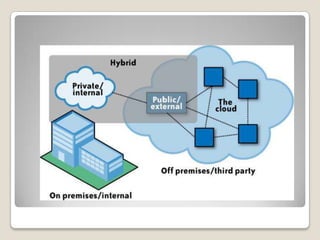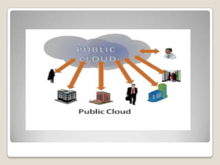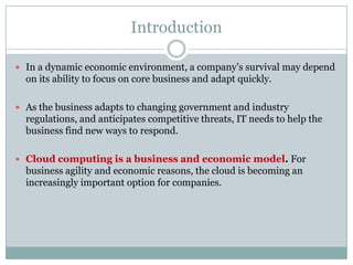 The document outlines the importance of cloud computing as a dynamic business model that enhances agility and efficiency. It discusses various cloud types—public, private, and hybrid—alongside their characteristics, advantages, and barriers to adoption in enterprises. Additionally, it highlights the future potential of cloud computing, driven by internet presence and innovations in various sectors.