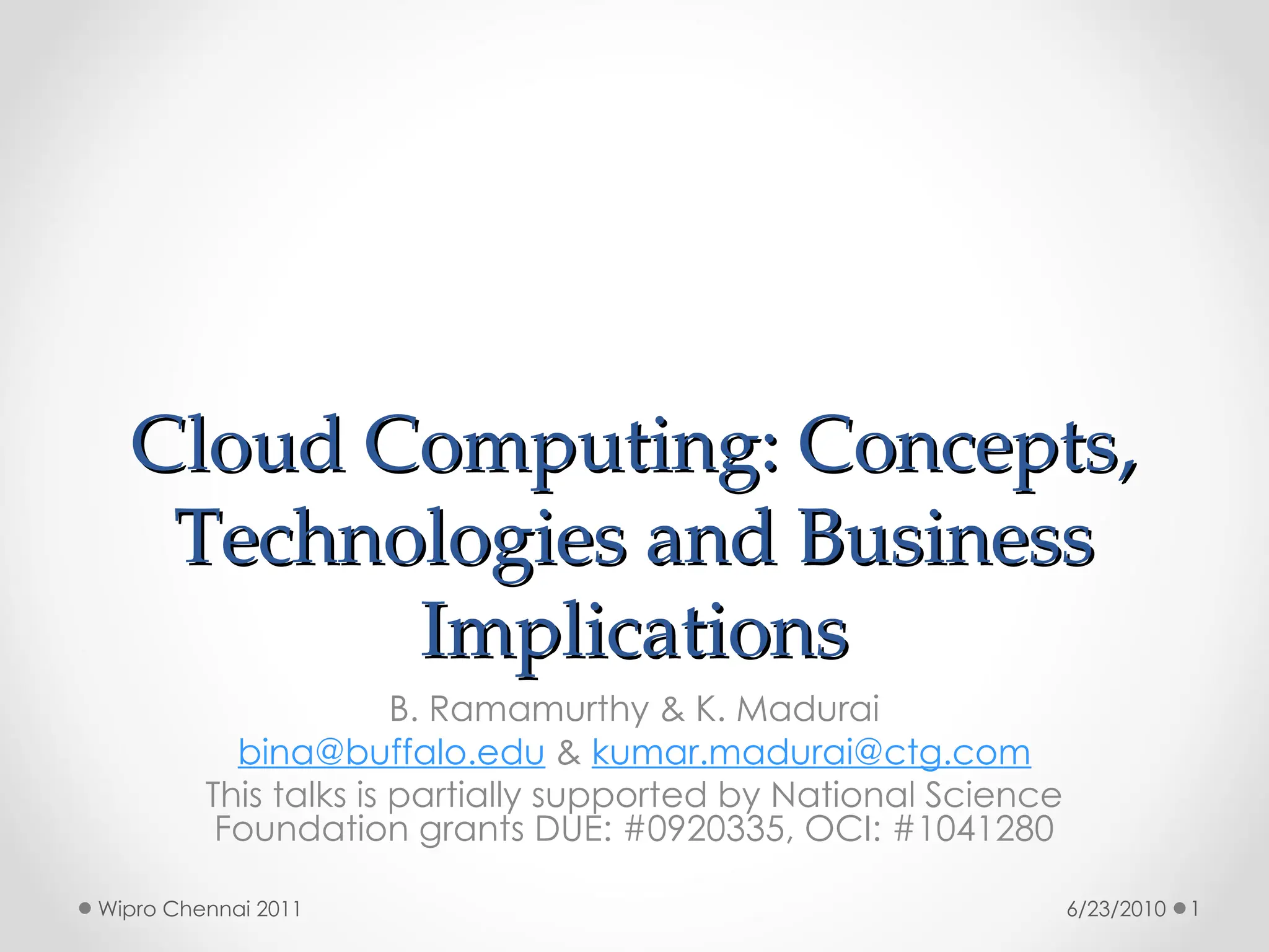 Cloud Computing: Concepts, CloudComputing: Concepts, Technologies and Business Technologies and Business Implications Implications B. Ramamurthy & K. Madurai bina@buffalo.edu & kumar.madurai@ctg.com This talks is partially supported by National Science Foundation grants DUE: #0920335, OCI: #1041280 6/23/2010 Wipro Chennai 2011 1