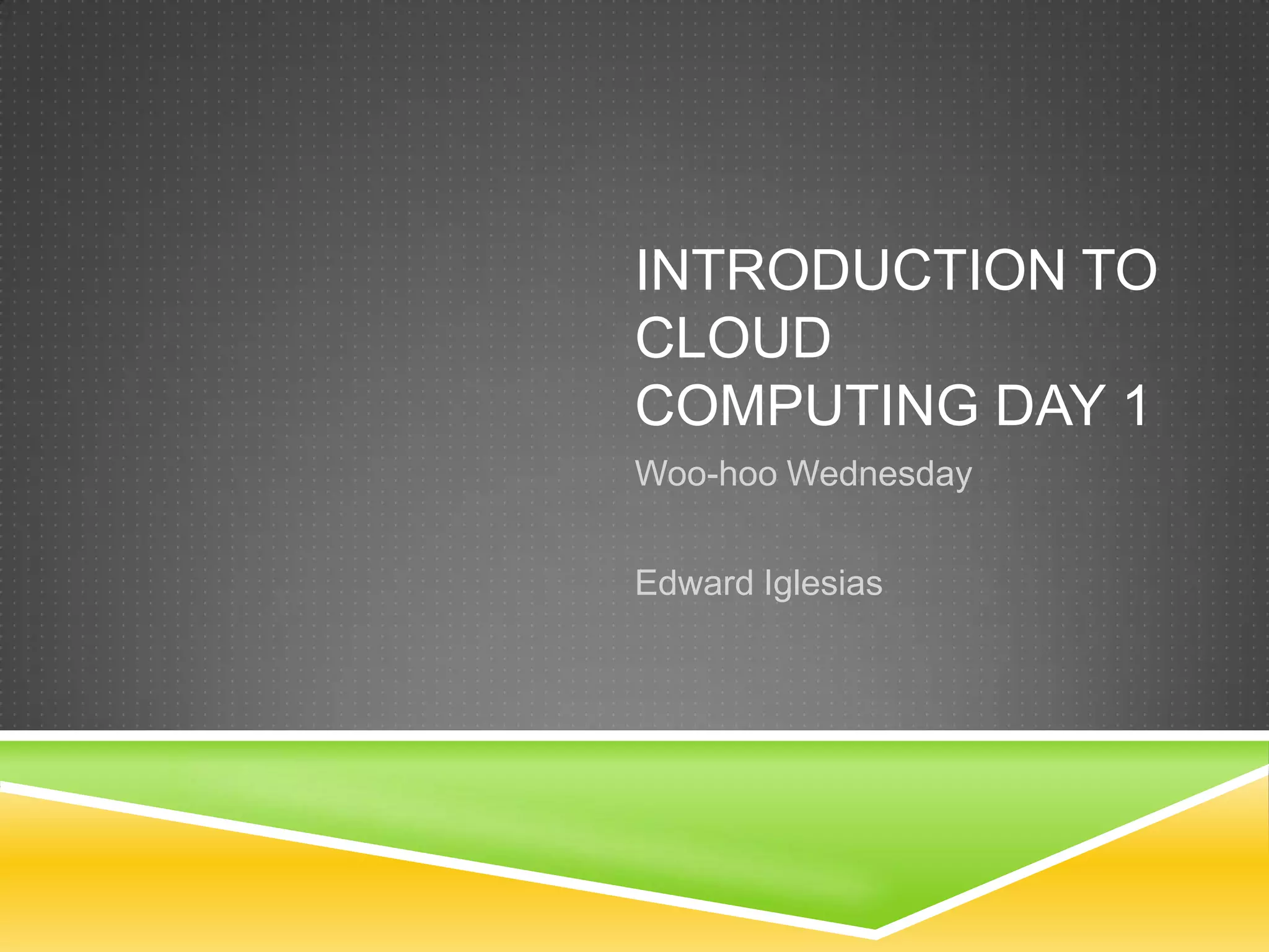 This document provides an introduction to cloud computing and examples of cloud services. It defines cloud computing as the delivery of computing resources as a service over the internet. It discusses public, private and community cloud models. It then gives examples of cloud services for data storage (Amazon S3), computing (Amazon EC2), productivity (Google Docs), finance (Mint), libraries (Consuls), databases (EbscoHost), and administration (Banner). The assignment is to create a Google Docs account and share a document.
