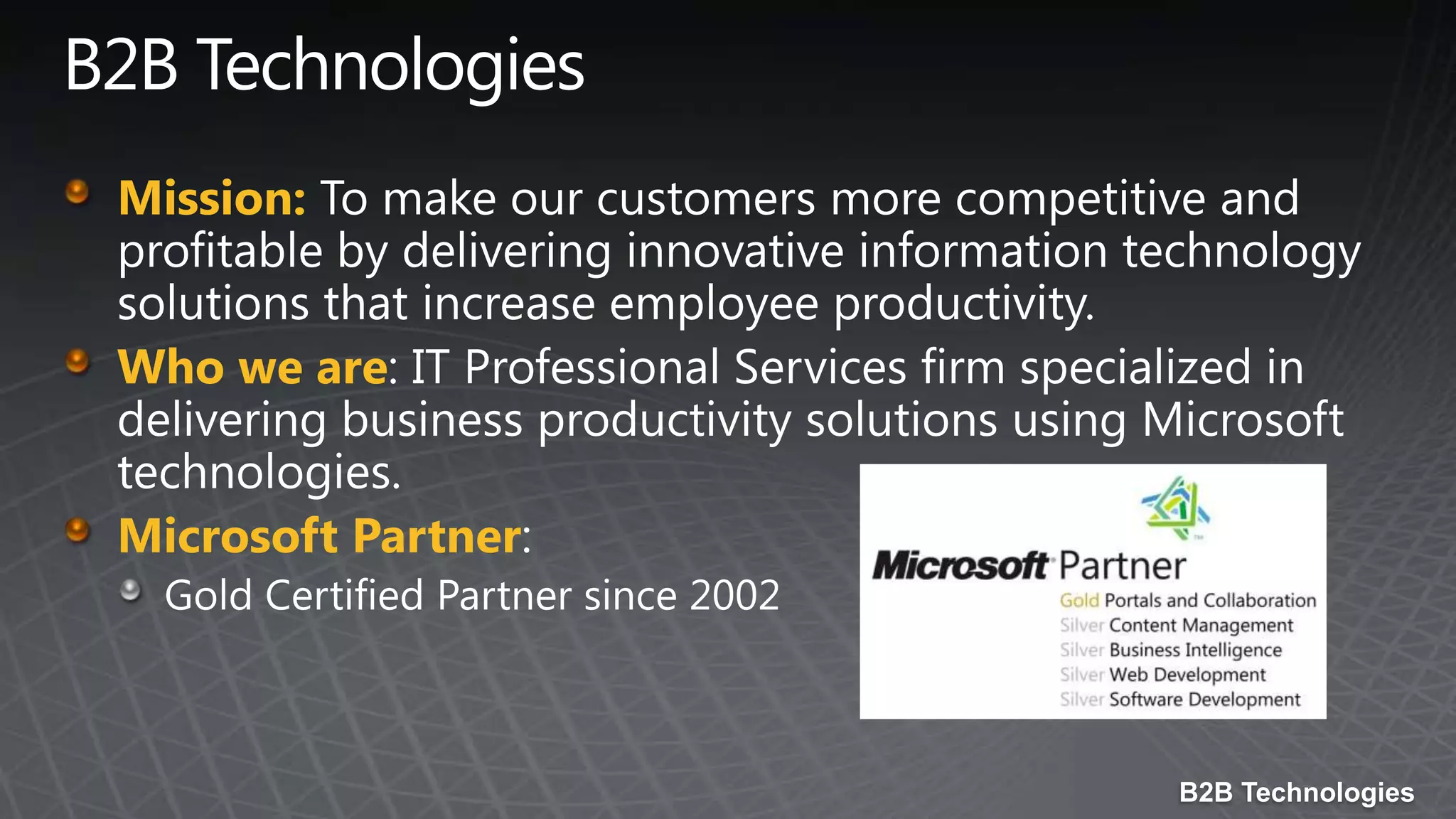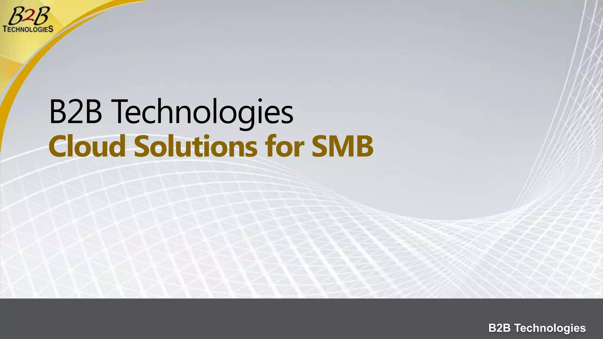 B2B Technologies is an IT consulting firm specializing in Microsoft technologies and cloud solutions to increase productivity for small and medium businesses. They offer SharePoint, Exchange, security, and business intelligence practices, as well as cloud services like Office 365. Office 365 provides cloud-based email, collaboration, file sharing, and business applications while ensuring reliability, security, and compliance through data replication and industry certifications. B2B is a Microsoft Gold Partner with expertise in helping businesses migrate to Office 365 through assessments, migrations, integration, training, and experience from over 50 previous migrations of over 250,000 users.