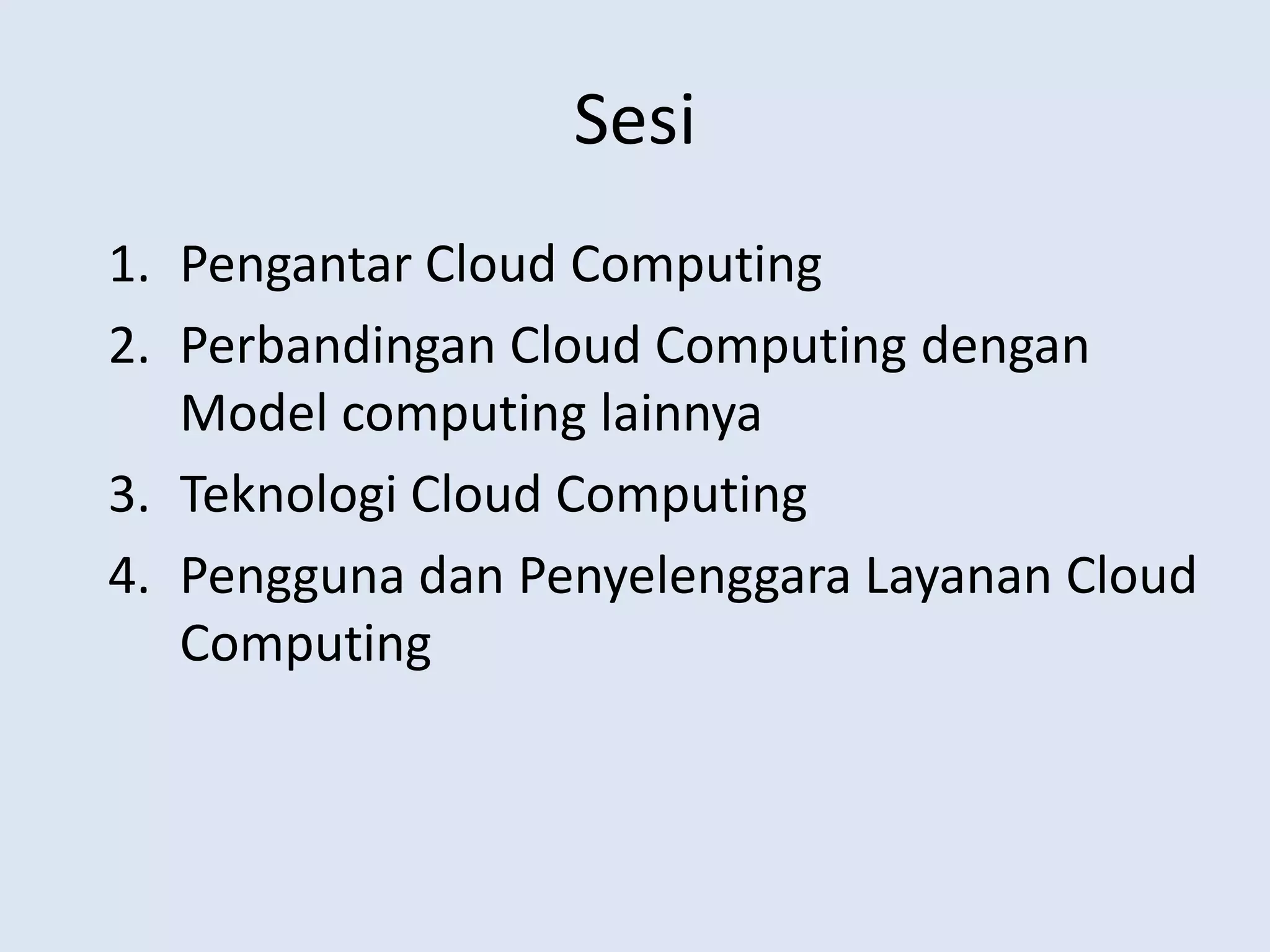 Dokumen tersebut membahas tentang pengantar Cloud Computing, perbandingannya dengan model computing lain, teknologi yang digunakan, penggunaan layanan cloud, dan keuntungan serta dampaknya. Beberapa poin penting yang dijelaskan antara lain definisi, 5 karakteristik, 3 model layanan, dan 4 model deployment Cloud Computing serta perbedaannya dengan desktop biasa dan jaringan komputer."