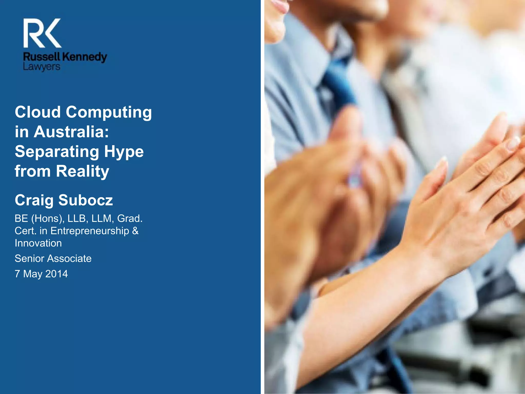 The document discusses the use and risks associated with cloud computing in Australia, highlighting legal, security, and privacy concerns. It outlines strategies for risk minimization during pre-contract, during and post-contract phases, emphasizing due diligence, clear service levels, and disaster recovery plans. The importance of robust vendor selection and compliance with privacy laws is also emphasized to ensure effective data management and protection.