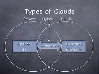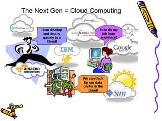 The document outlines the fundamental concepts and benefits of cloud computing, detailing its history, types (public, private, hybrid), and service layers (SaaS, PaaS, IaaS). It emphasizes the significance of cloud computing for organizations like NASA, highlighting how it can enhance their computational capabilities and data management. The text also discusses various applications and future potential within educational contexts.
