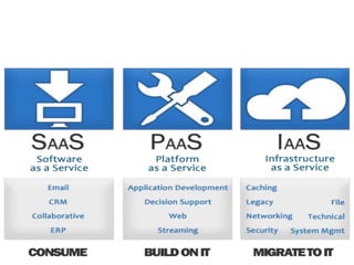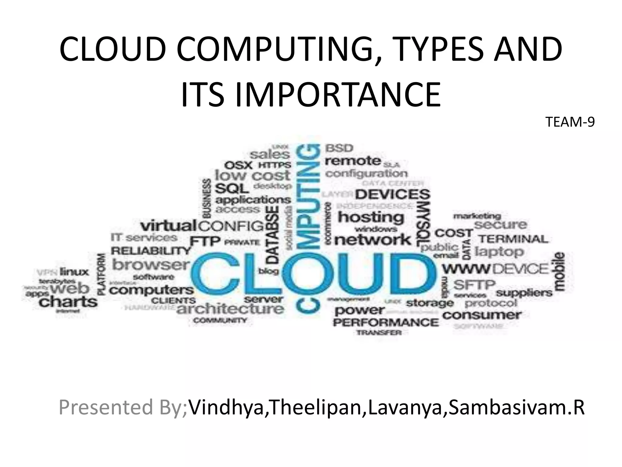 Cloud computing allows companies to access computing resources like virtual machines, storage, and applications over the internet rather than maintaining their own infrastructure. It has several types including public, private, and hybrid clouds that provide services through software, platforms, and infrastructure as a service models. Cloud computing provides important benefits like reduced costs, increased storage, flexibility, availability during disasters, and lower environmental impact. However, it also presents disadvantages regarding data security, recovery, and compliance with regulations.
