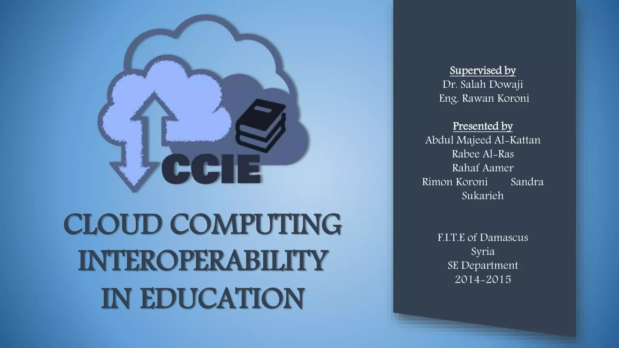 This document presents a solution for cloud computing interoperability in education. It discusses the problems of managing different devices and a lack of resources. The proposed solution is interoperability through a system architecture that uses ontologies. The architecture includes a cloud computing catalog, service contracts, and policies. Ontologies like OWL-S and a cloud service ontology are used to remove ambiguity and unify descriptions. An implementation loads distribution and administration through the system. The conclusion discusses advantages like cost reduction and future work on expanded usage and protection.