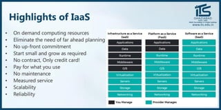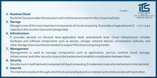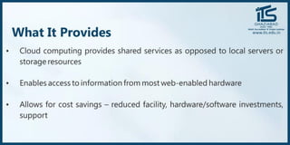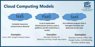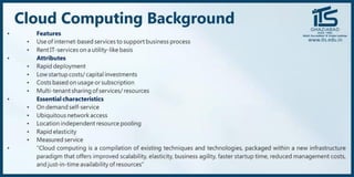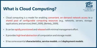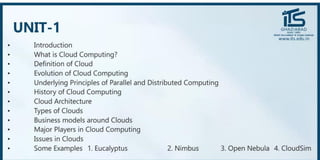 The document provides recommendations for books on cloud computing concepts and technologies. It then discusses the history and drivers of the Fourth Industrial Revolution powered by cloud, social, mobile, IoT, and AI technologies. The document defines cloud computing and discusses characteristics such as on-demand access to computing resources, utility computing models, and service delivery of infrastructure, platforms, and applications. It also outlines some major cloud platform providers including Eucalyptus, Nimbus, OpenNebula, and the CloudSim simulation framework.