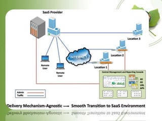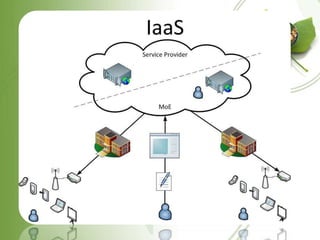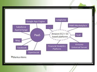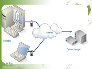 This document provides an overview of cloud computing, including the different types (IaaS, PaaS, SaaS, etc.), how it works by hosting information on remote servers accessed over the internet, the benefits of scalability and reduced costs, and the risks around loss of control and dependency on cloud providers. It also discusses cloud clients, examples of cloud applications, and storage as a service.