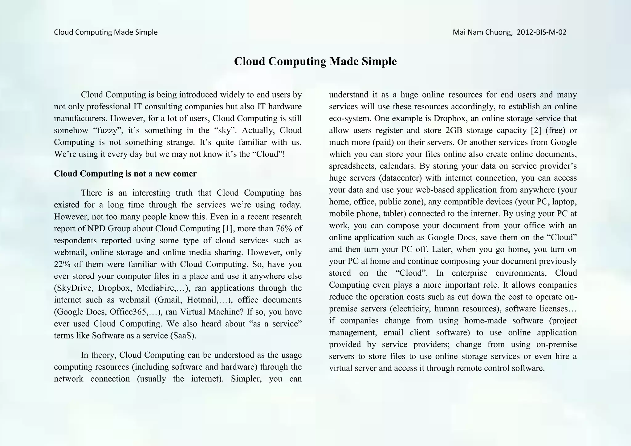 Cloud computing provides online resources and services through which users can access files, applications, and computing power over the internet. It has existed for some time through common services like webmail, online storage, and media sharing, but many users are still unfamiliar with the term. Cloud computing involves accessing software, platforms, and infrastructure as online services rather than through local machines. Popular examples include file storage services like Dropbox, office applications like Google Docs, and virtual servers from Amazon EC2. It allows users access to resources from any internet-connected device and provides businesses flexibility and cost savings over on-premise systems.