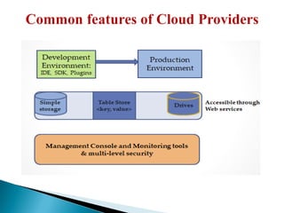The document outlines various common standards and cloud platforms, discussing the roles of organizations like the Open Cloud Consortium in developing interoperable cloud computing standards. It details major cloud services including Amazon Web Services, Google App Engine, and Microsoft Azure, emphasizing their features, pricing models, and infrastructure. Additionally, it covers common technical standards related to data interchange, security protocols, and applications in the cloud computing ecosystem.