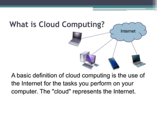 Cloud computing refers to using applications and services provided over the Internet rather than software installed locally. It allows users to access applications from any device with a web browser. Key benefits are lower upfront costs since users pay monthly fees rather than purchasing software licenses, and easier maintenance since applications are hosted remotely rather than on individual devices. However, concerns about downtime, data security and managing cloud services remain challenges to adoption.