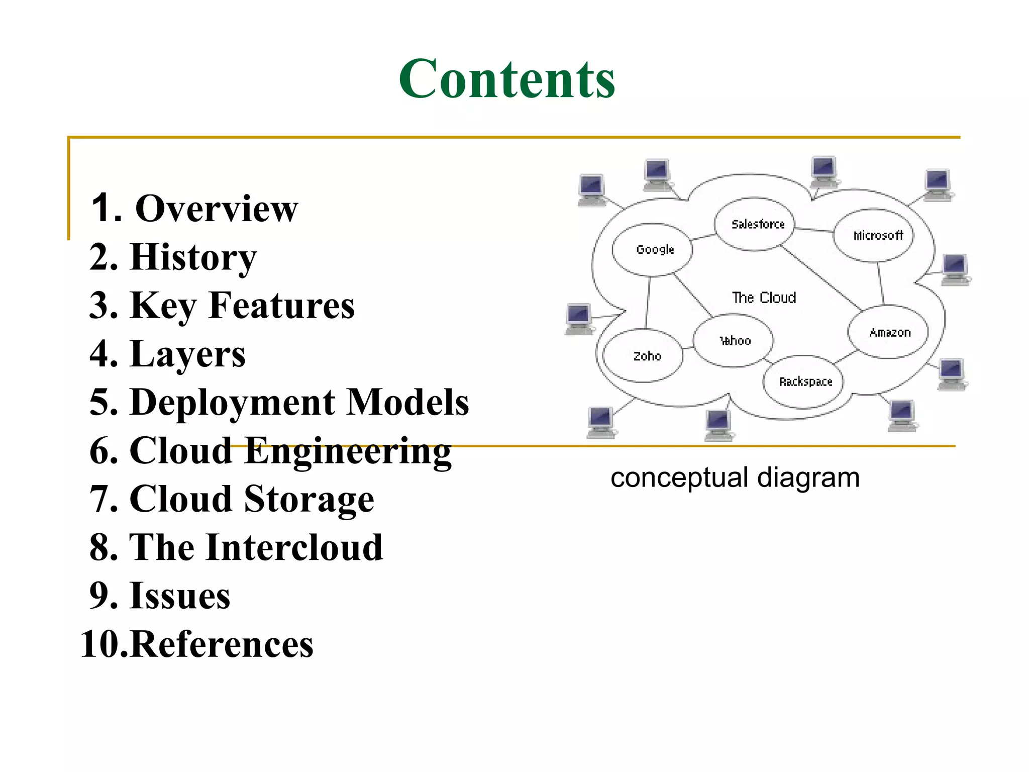 The document provides an overview of cloud computing, including its history, key features, deployment models, layers, engineering, storage, interconnection of clouds, and issues. It discusses how cloud computing evolved from earlier concepts and allows users to access computing resources over the internet on an as-needed basis. Some challenges include privacy, legal concerns, use of open standards and security issues.