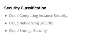 This document discusses security considerations for cloud computing instances, networking, and storage. It recommends using bastion servers for CLI access with key-based authentication over secure protocols. For instances, it suggests using LTS OS releases, security patches, and HIDS for critical hosts. Networking advice includes using subnets for applications, public subnets only for public-facing systems, and private subnets with NAT for non-public systems. The document also recommends encrypting sensitive stored data with role-based access controls and logging, and storing authentication materials securely.