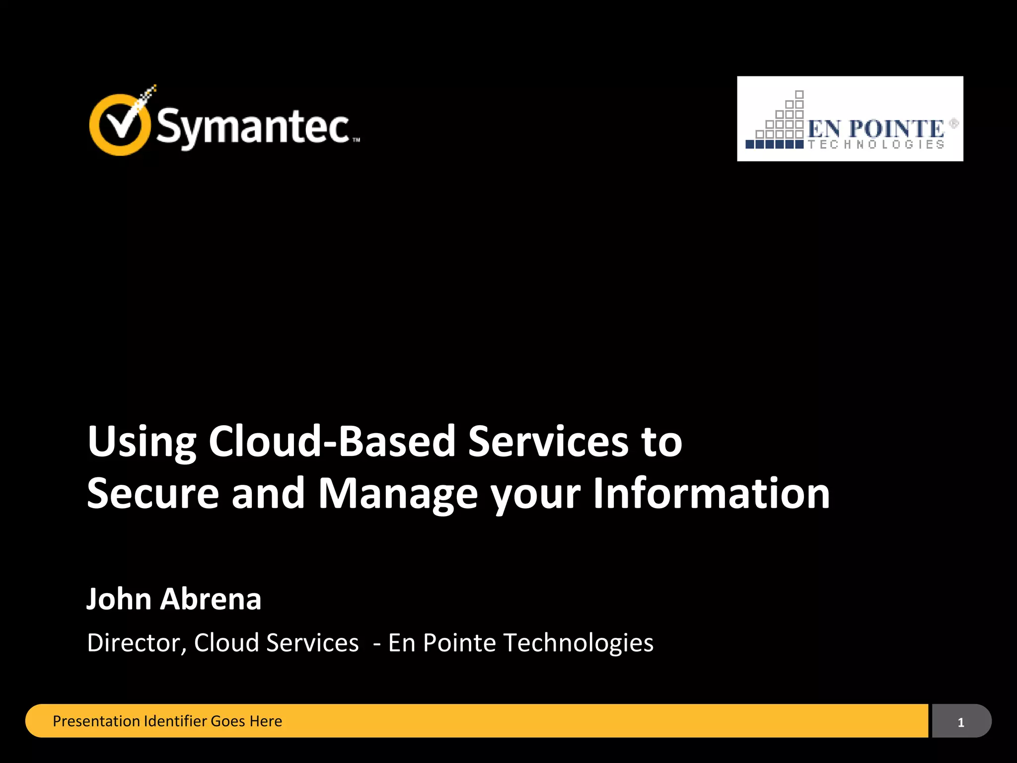 John Abrena, Director of Cloud Services at En Pointe Technologies, discusses how cloud-based services can help secure and manage information. He explains that information has value and must be protected, and that cloud services provide easy deployment, automatic updates, pay-as-you-go pricing and easy scaling. Symantec offers various cloud-based security and availability solutions that simplify IT. Migrating services like email security, web security and backup to the cloud reduces complexity while maintaining industry-leading security standards.