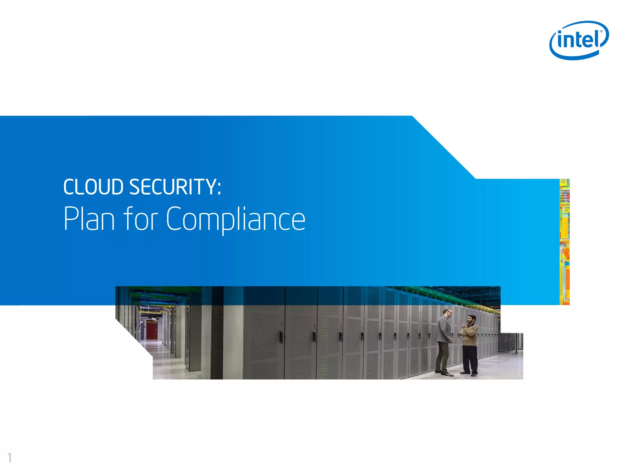 The document discusses cloud security and compliance. It notes that security compliance has become more complex with growing threats and virtualization. It emphasizes the need to trust hardware, resources, and verification processes used. Intel Trusted Execution Technology is highlighted as a way to determine if a system can be trusted and establish a pool of known good resources. Compliance reporting and added protection are also benefits. Downloading a security planning guide is recommended to learn how to protect data from device to data center.