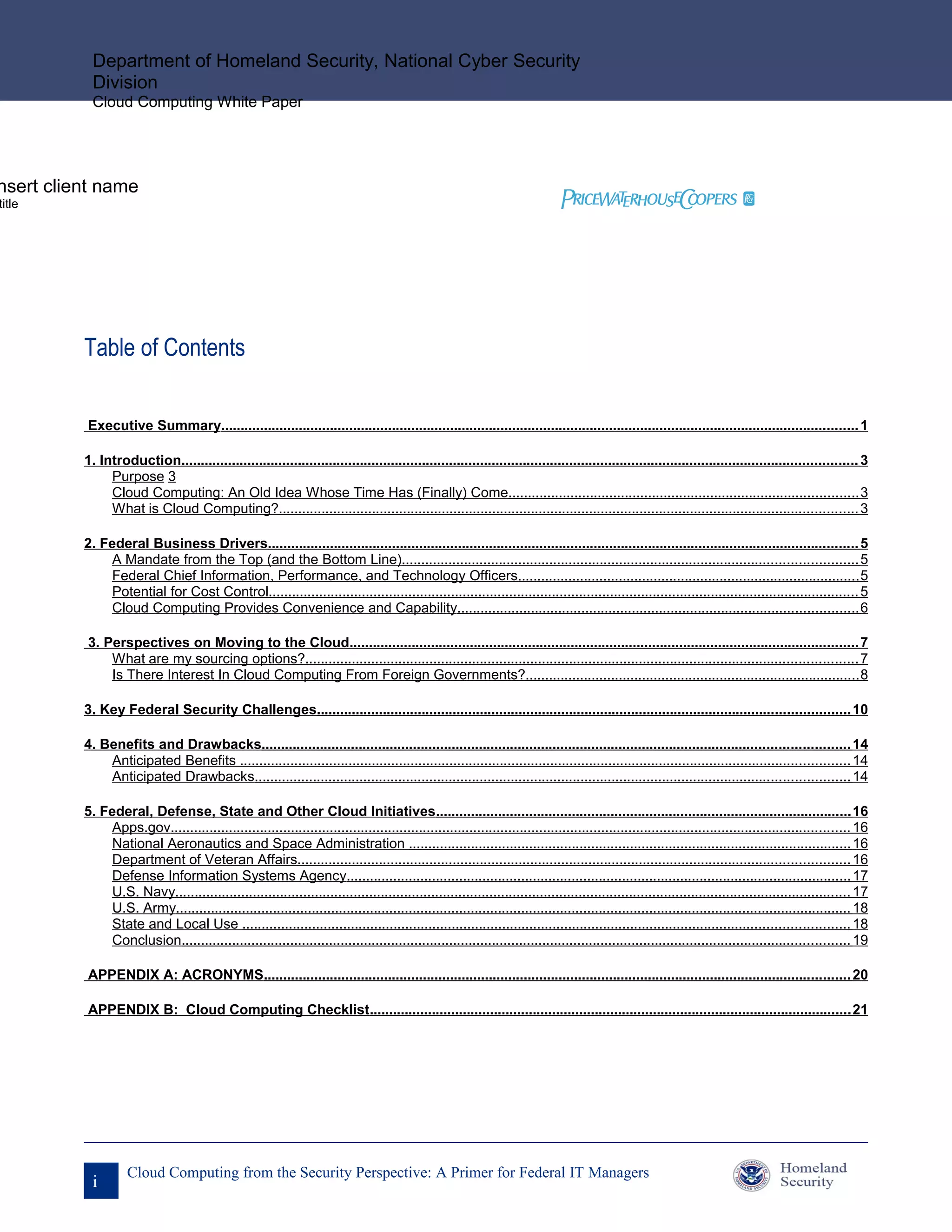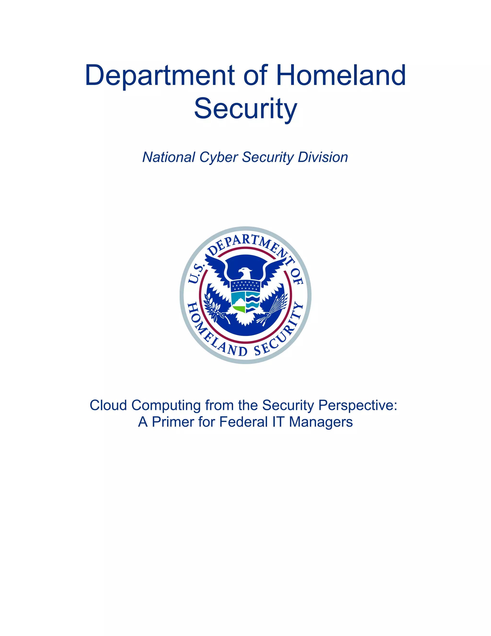 This document provides an overview of cloud computing from a federal IT security perspective. It discusses the benefits of cloud computing including potential cost savings, increased flexibility and capabilities. It also examines some of the key security challenges for federal agencies in moving to cloud computing environments, such as ensuring proper security controls are in place with cloud vendors and understanding changes to responsibilities. Several federal cloud computing initiatives are also highlighted from agencies such as NASA, VA and DISA. Overall the document presents cloud computing as an evolving model that could modernize federal IT if security risks are adequately addressed.