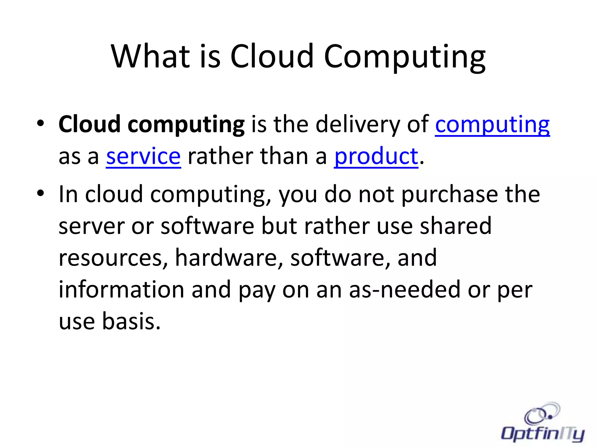 Cloud computing allows users to access computing resources like servers, databases, networking, software and analytics over the internet. It provides services on demand in a flexible, scalable way with users only paying for what they use. Common uses of cloud computing include email, file storage, collaboration tools and virtual servers. While it offers benefits like lower costs, easier setup and scalability, disadvantages can include lack of control over downtime and security concerns about storing data online.