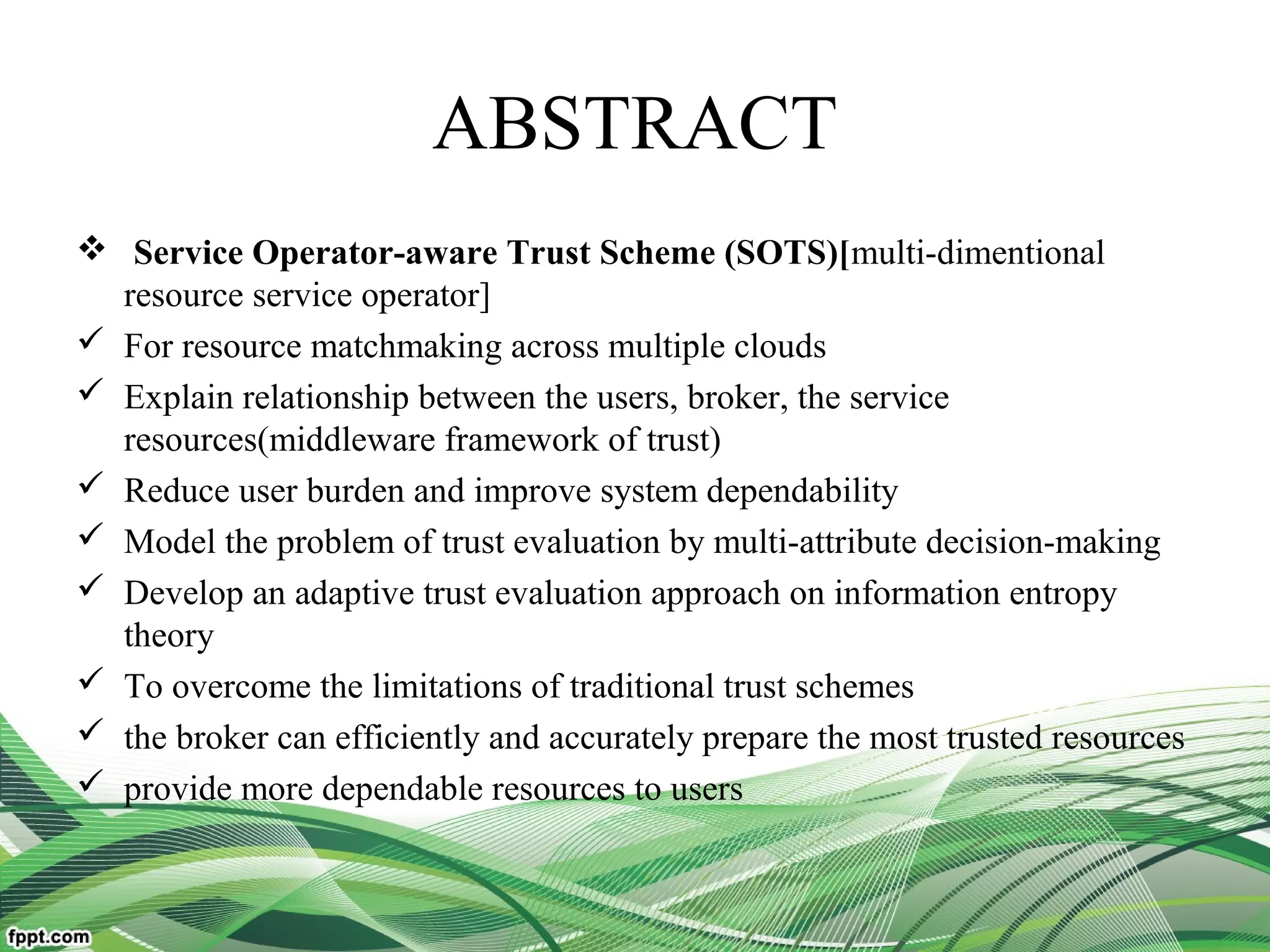 The document discusses a service operator-aware trust scheme (SOTS) for resource matchmaking across multiple clouds, aiming to enhance user trust and system dependability by modeling trust evaluation through multi-attribute decision-making. It develops an adaptive trust evaluation approach based on information entropy theory, overcoming limitations of traditional trust methods. The proposed scheme is designed to accurately identify trusted resources and improve resource dependability in cloud environments.