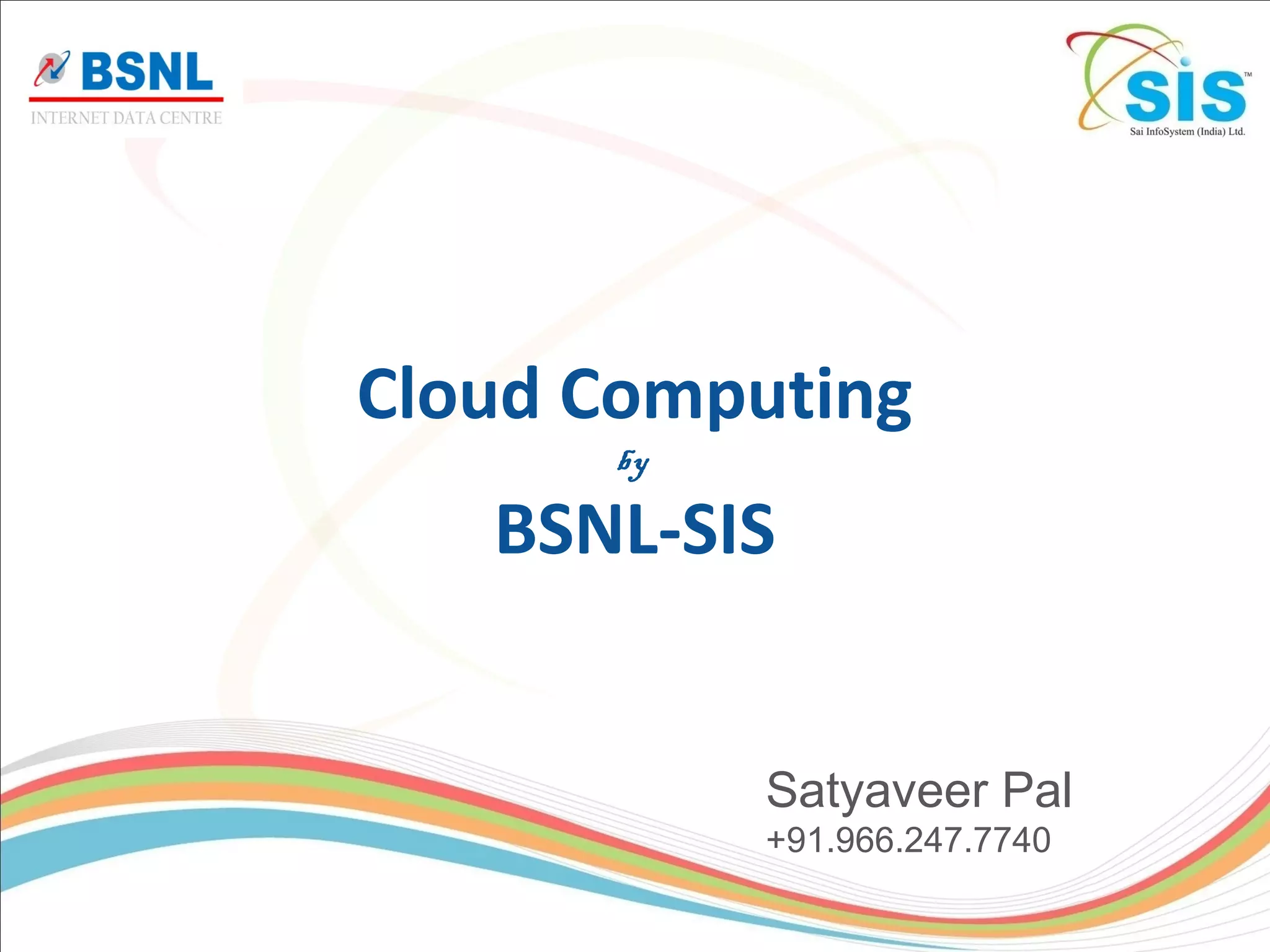 BSNL-SIS provides cloud computing services from its data centers in India. It has expertise in building and operating secure, standards-compliant data centers. BSNL-SIS offers infrastructure as a service (IaaS), platform as a service (PaaS), software as a service (SaaS), and security as a service (SecaaS). Using BSNL-SIS services can help reduce total cost of ownership and improve return on investment for customers. For more information, contact Satyaveer Pal.