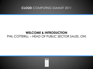The document summarizes a cloud computing summit that took place in 2011. It includes the agenda for presentations on cloud computing from various speakers, including John Suffolk, the former CIO of the UK Government. Suffolk's presentation discussed how technology is advancing rapidly, outpacing many organizations, and suggested governments need to transform public services through approaches like outsourcing, shared services, and moving to a common infrastructure and cloud computing to address challenges like duplication and reduce costs.