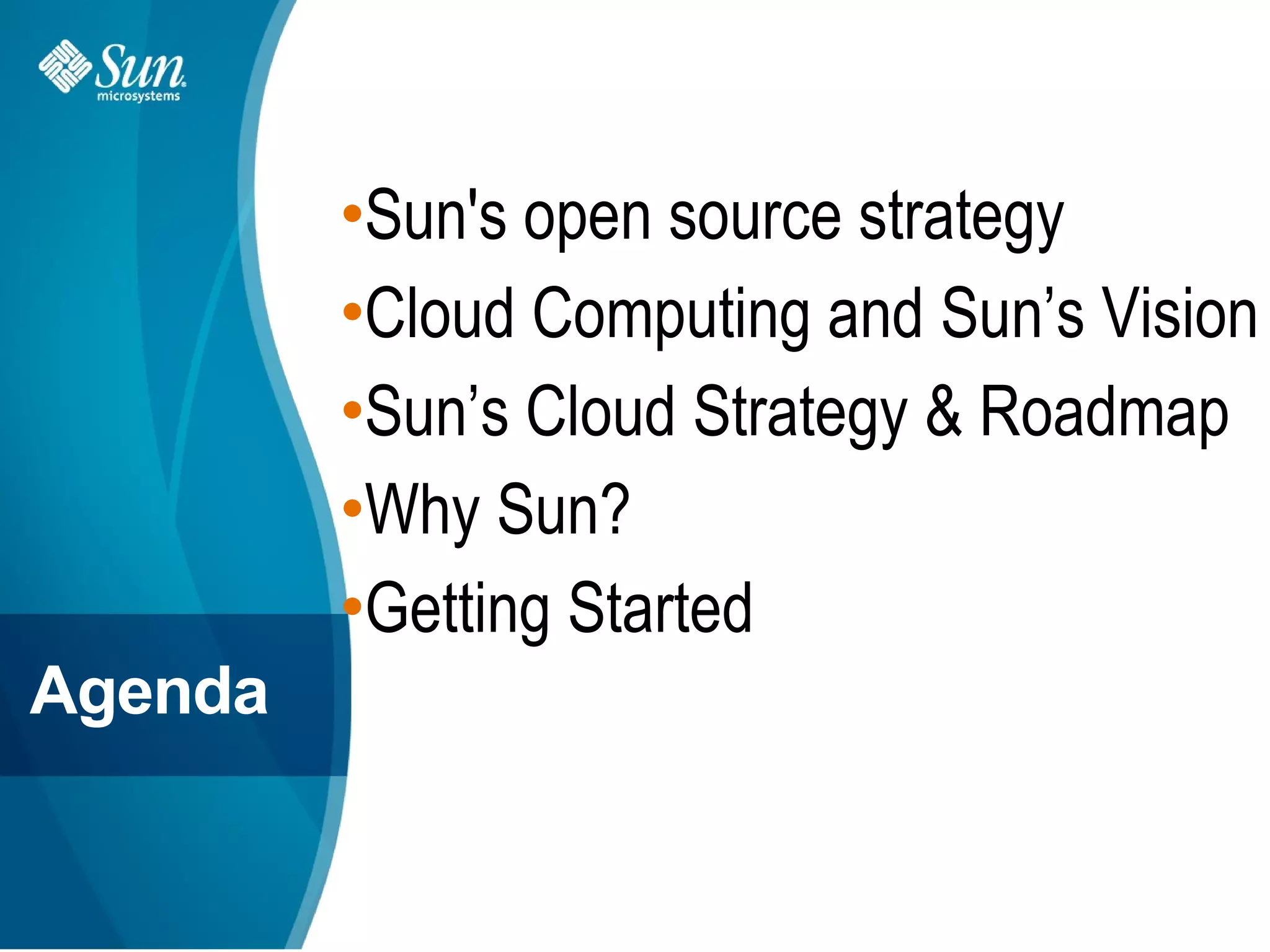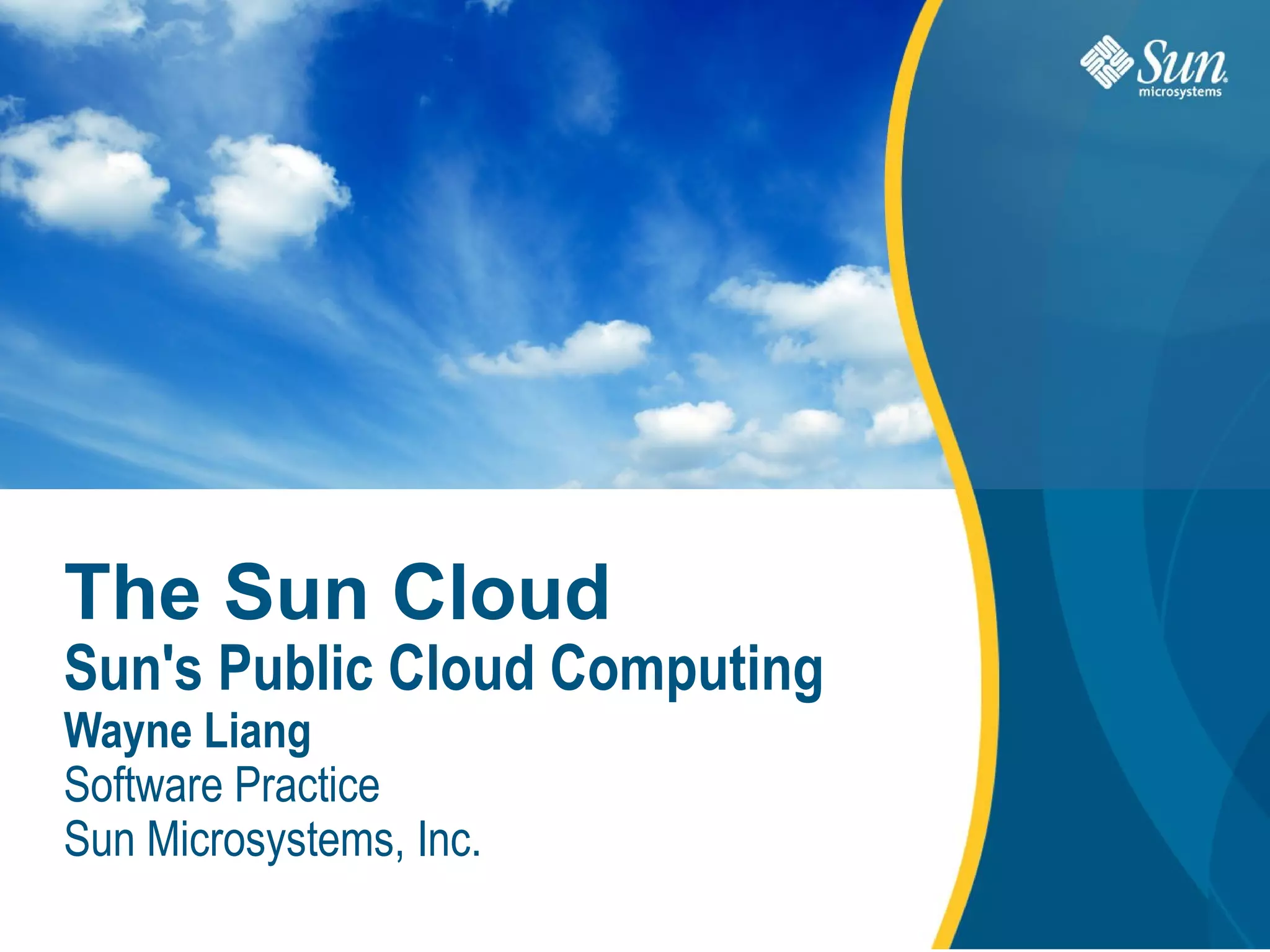 - Sun Microsystems presents its vision and strategy for cloud computing, including developing an open cloud platform and offering cloud services through the Sun Cloud.