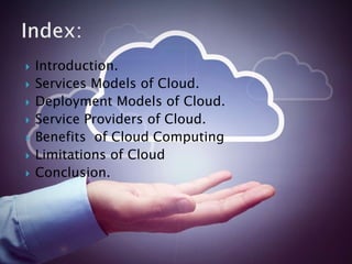The document discusses cloud computing, defining it as a model relying on shared resources accessed via the internet, detailing three main service models: SaaS, PaaS, and IaaS, and their respective benefits and limitations. It also outlines four deployment models: public, private, community, and hybrid clouds. The document concludes that cloud computing is a rapidly evolving technology with significant advantages for users and organizations, despite challenges such as security and internet dependency.