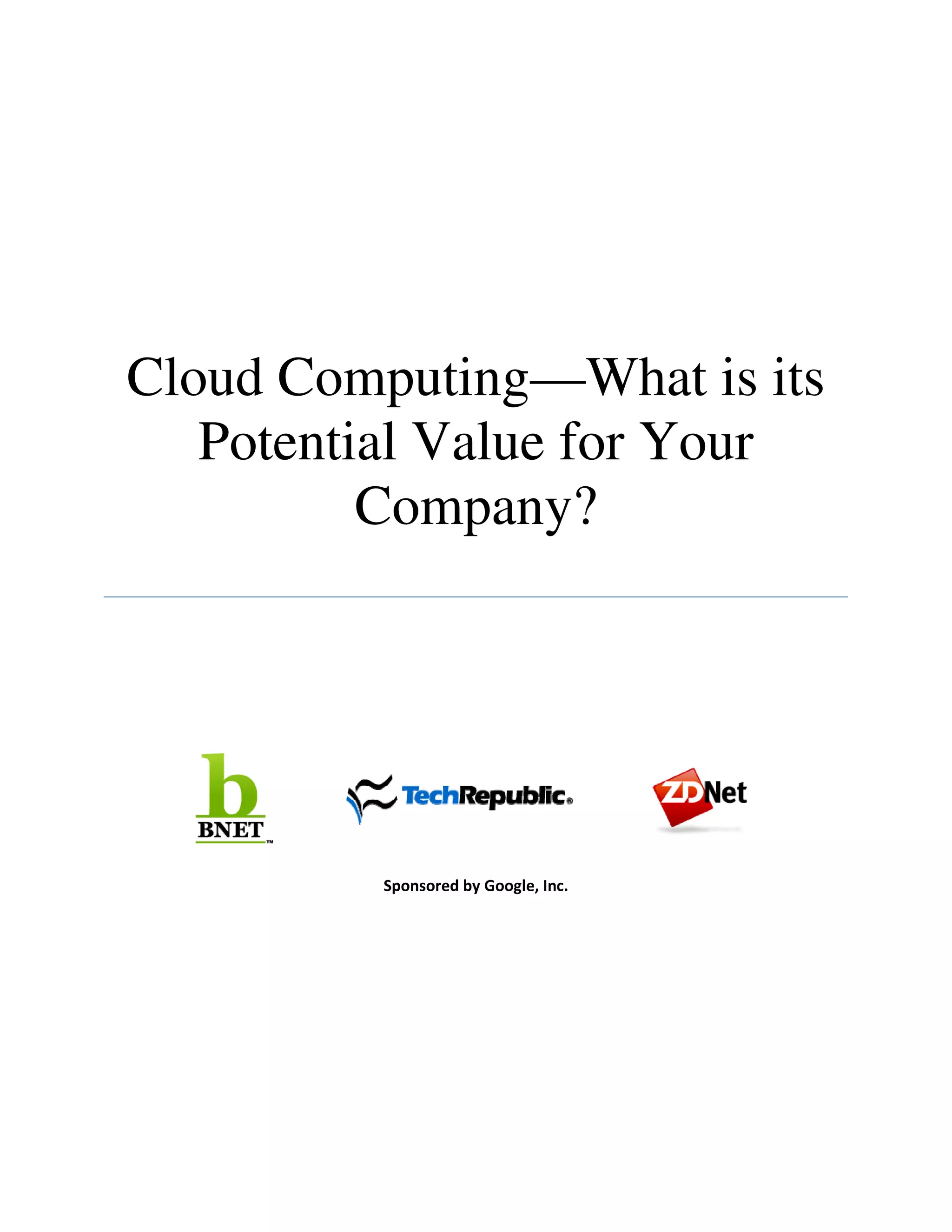 This document discusses the potential value of cloud computing for companies. It provides predictions that cloud computing will become more widely adopted and used for collaboration. Case studies of four organizations show how they achieved cost savings and productivity gains by using Google Apps cloud services. These organizations were able to improve collaboration, scalability, security and reduce IT costs.