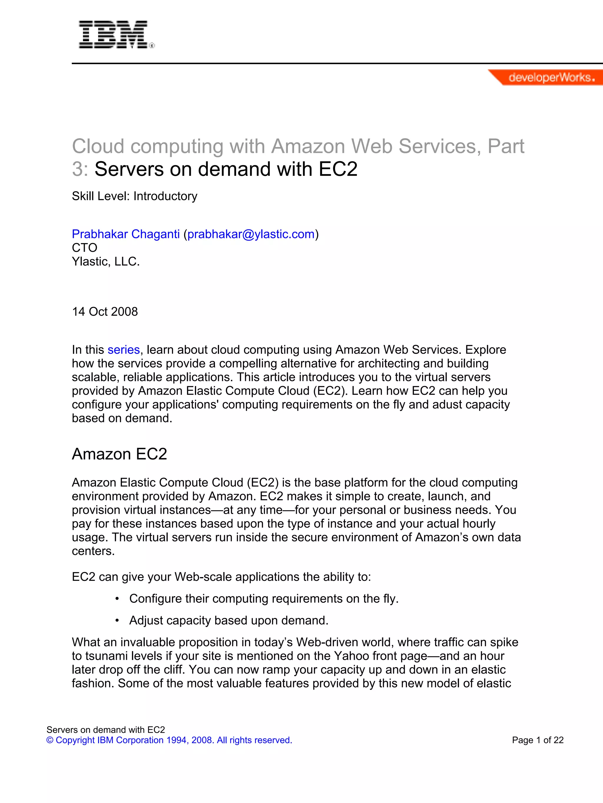 This document introduces Amazon EC2, a cloud computing service that provides virtual servers. EC2 allows users to configure computing capacity on demand, adjusting resources based on traffic needs. Users launch instances of virtual servers from templates called Amazon Machine Images (AMIs). Instances can be configured in different sizes and launched across multiple data center locations for reliability. Security features like security groups and keypairs control access to instances.