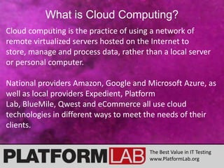 This document discusses cloud computing and cloud technology options. It describes cloud computing as using remote virtual servers over the Internet rather than local servers. It mentions several national and local cloud providers, including Amazon, Google, Microsoft Azure, Expedient, Platform Lab, BlueMile, Qwest and eCommerce. The document discusses how cloud computing can save money and increase capabilities by utilizing remote infrastructure instead of local hardware. It provides examples of common cloud computing uses like email, web hosting, apps and storage. The document also describes Platform Lab and how it provides affordable cloud services and infrastructure for testing.
