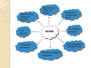 This document provides an introduction to cloud computing, including definitions, models, and characteristics. It defines cloud computing as accessing applications over the Internet as utilities. There are three deployment models (public, private, hybrid clouds) and three service models (Infrastructure as a Service, Platform as a Service, Software as a Service). Key characteristics of cloud computing include on-demand self-service, broad network access, resource pooling, and rapid elasticity.