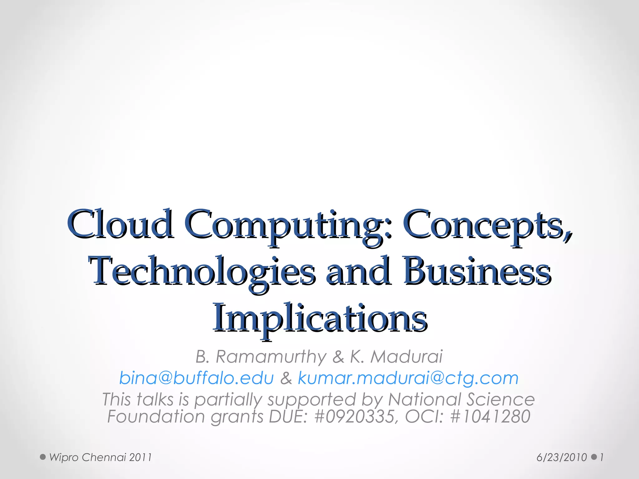 This document discusses cloud computing concepts, technologies, and business implications. It provides an introduction to cloud models including Infrastructure as a Service (IaaS), Platform as a Service (PaaS), and Software as a Service (SaaS). It also demonstrates cloud capabilities through examples of cloud models, data and computing models using MapReduce, and graph processing using Amazon Elastic MapReduce. The document discusses enabling cloud technologies including virtualization, multi-core architectures, and web services interfaces.