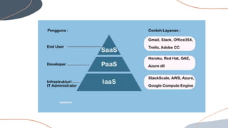 Cloud computing adalah teknologi yang mengizinkan penyimpanan dan akses data secara online dengan meningkatkan efisiensi dan efektivitas kerja, memungkinkan pengguna untuk mengakses aplikasi tanpa perlu menginstalasi perangkat lunak di komputer fisik. Jenis layanan cloud computing meliputi Software as a Service (SaaS), Platform as a Service (PaaS), dan Infrastructure as a Service (IaaS), yang memberikan fleksibilitas dan meningkatkan kolaborasi serta produktivitas. Contoh layanan SaaS di Indonesia termasuk Gawean, Gadjian, dan Jubelio, yang menawarkan solusi untuk kebutuhan bisnis dan manajemen sumber daya manusia.