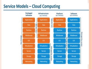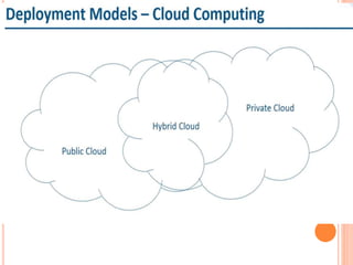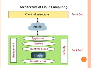Cloud computing uses remote servers accessed via the internet to store and manage data rather than local drives. It allows organizations to store information in the cloud and access it from anywhere using an internet connection. Cloud computing architecture has a front end accessed by clients and a back end managed by service providers, with components including client infrastructure, applications, services, runtime environments, storage, security, and the internet connecting them. Common cloud service models are Infrastructure as a Service (IaaS), Platform as a Service (PaaS), and Software as a Service (SaaS).