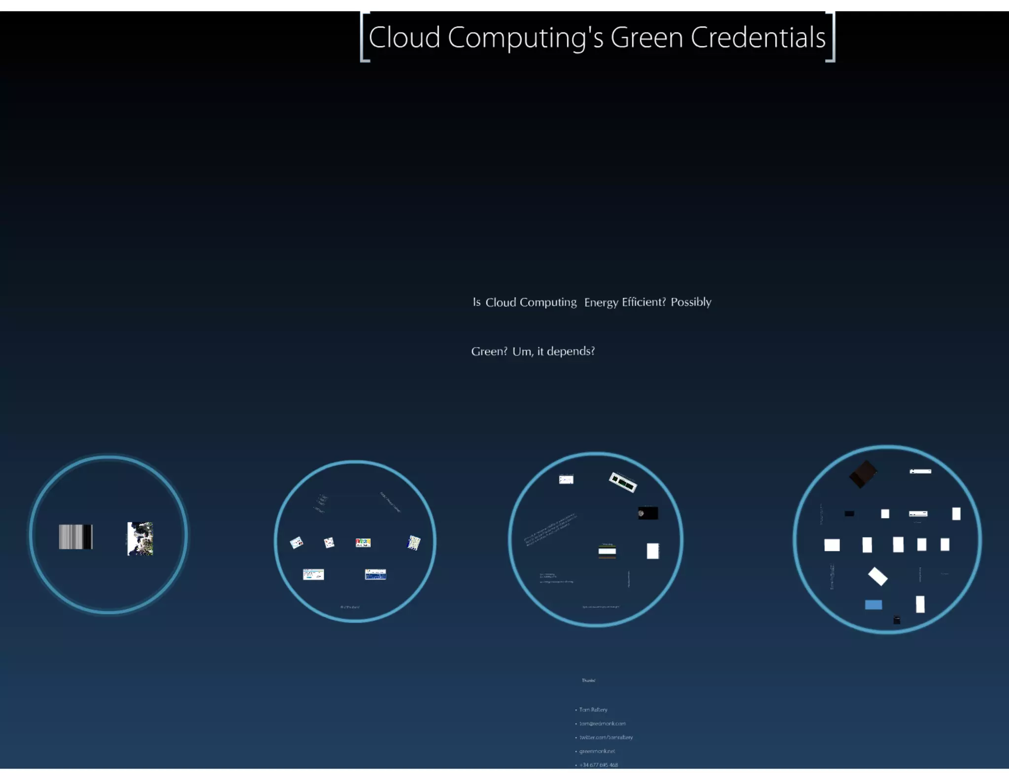 I created this talk using Prezi - it was my first Prezi talk so be gentle!!! The original Prezi version is available at http://prezi.com/a6m9zmxukean/cloud-computings-green-credentials/ Cloud Computing is the new hotness. Everyone is touting it's energy efficiency and Green-ness - but just how Green is Cloud Computing actually? Cloud providers are not publishing their energy consumption data (Watts/Compute Cycle) so it is impossible to say whether cloud computing is energy efficient, or not. Green is a whole other issue - until cloud providers are powering their DC's with renewable resources, they will not be Green.