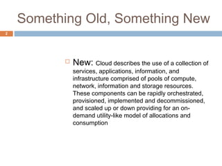 This document discusses security issues related to cloud computing. It defines cloud computing and outlines the essential characteristics, service models, and deployment models. It also addresses key security concerns including governance, legal issues, compliance, information lifecycle management, and risks associated with loss of control over data and applications in the cloud. The document emphasizes that security responsibilities are shared between cloud providers and users, and both parties need to understand their roles.