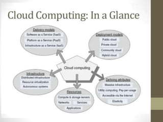 The document discusses various cloud computing textbooks and the growing paradigm of cloud computing, emphasizing its utility-like delivery model for IT services. It explains the definition of cloud computing, its deployment models, characteristics, benefits, historical developments, and ongoing challenges, including privacy and security issues. It also highlights how cloud technology enables users and businesses to access resources efficiently without heavy upfront costs.