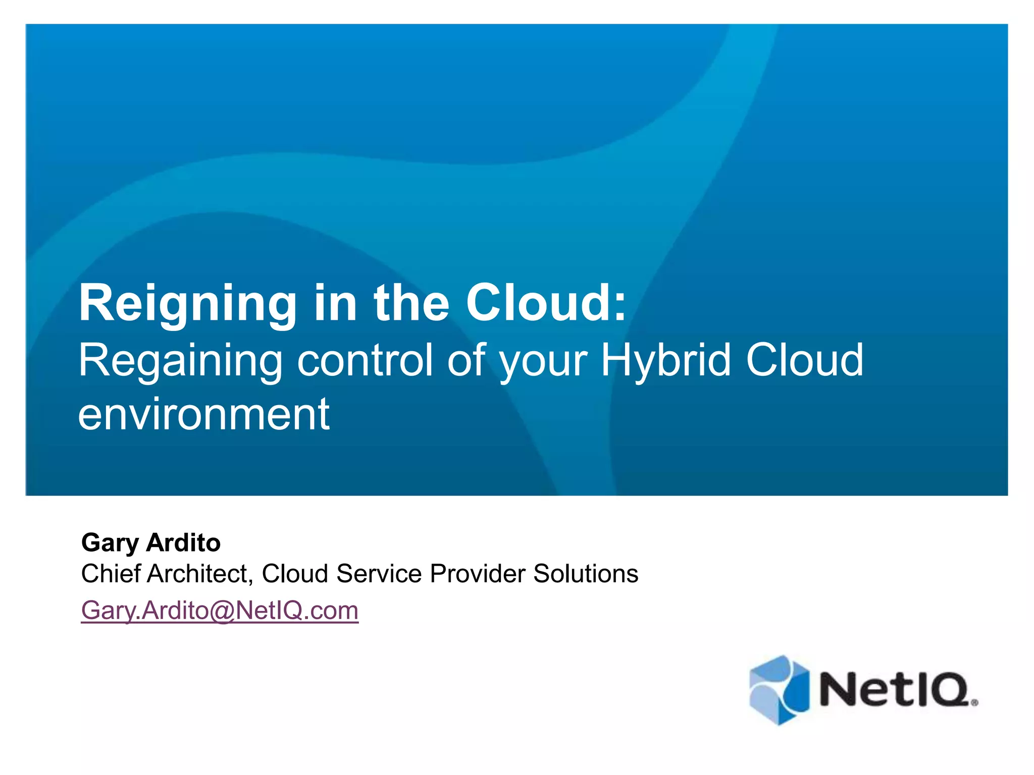 The document discusses how organizations can regain control over their hybrid cloud environments through identity and access management, visibility, and continuous compliance. It recommends starting with a strong identity fabric and leveraging identity context to gain awareness and visibility. Continuous monitoring is needed to maintain security and compliance across physical, virtual, and cloud systems through automation and real-time alerts. Role-based dashboards can provide the right visibility for different users. NetIQ provides expertise and products that can help power cloud service providers and enterprises in securing hybrid cloud environments.