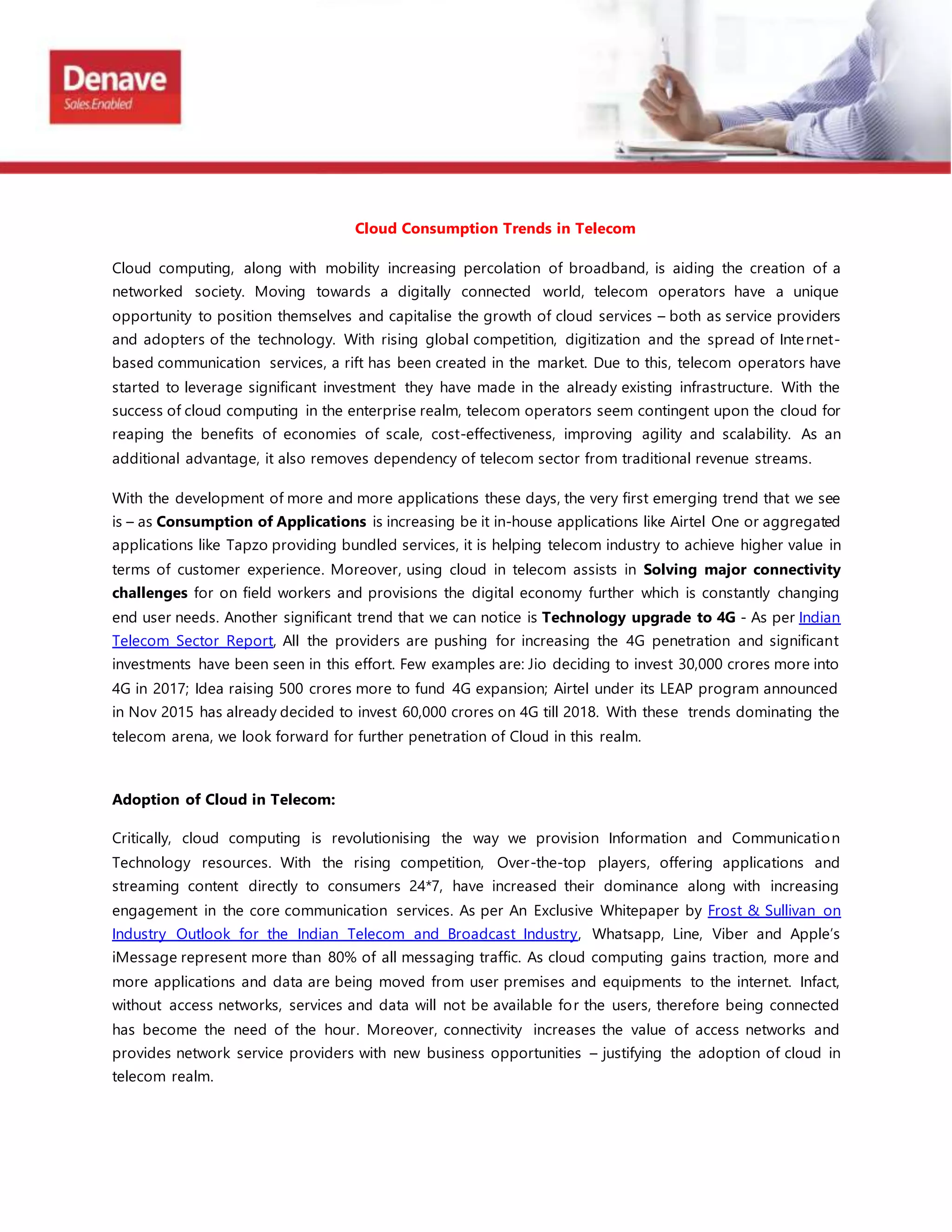 The document discusses the impact of cloud computing on the telecom industry, emphasizing opportunities for telecom operators as they adapt to rapidly changing consumer needs and competitive pressures. It highlights trends such as the shift towards 4G, rising investments in cloud services, and the importance of cloud infrastructure in enhancing customer experiences. The future expectations include increasing cloud consumption, growth of connected devices, and the transformation of traditional revenue models as telecom companies integrate cloud solutions into their strategies.