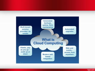 Cloud computing is a model for enabling ubiquitous, convenient, on-demand network access to a shared pool of configurable computing resources that can be rapidly provisioned and released with minimal management effort or service provider interaction. Key characteristics include broad network access, resource pooling, rapid elasticity, and measured service. Common deployment models are public, private and hybrid clouds. Common cloud services are Infrastructure as a Service (IaaS), Platform as a Service (PaaS) and Software as a Service (SaaS).
